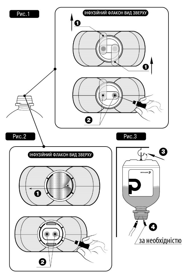 Зняти ковпачок із голки та вставити у будь-який зі спеціальних портів № 2 флакона з інфузійним лікарським засобом (див. рис. 1 та рис. 2).